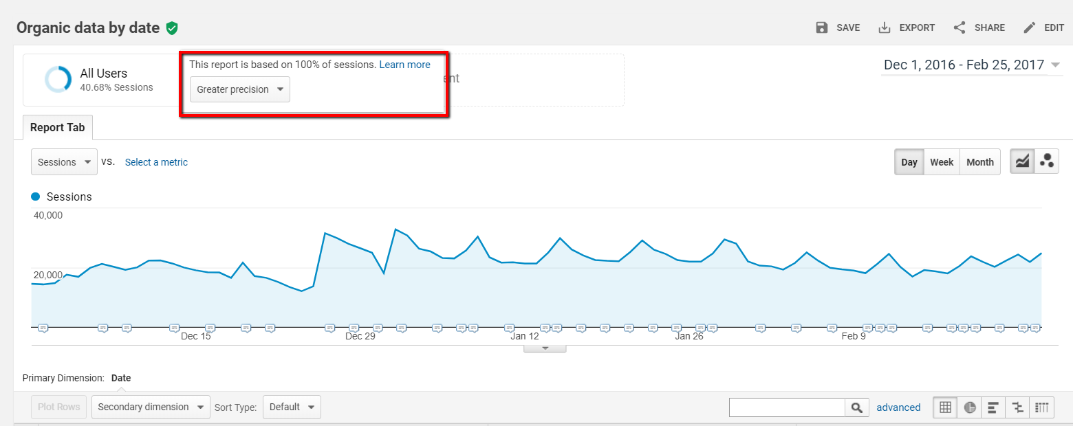 Analytics platforms have a tendency to sample data and sometimes this can lead to it be wildly un-representative (like creating a traffic drop). Let's make sure we're not seeing an artifact of sampling.
